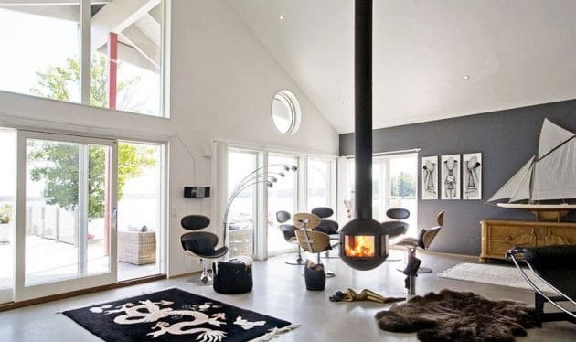 This round, floating, natural vent fireplace is cleverly crafted and designed with a glass-paneled fireguard so the fire can be viewed from all sides.